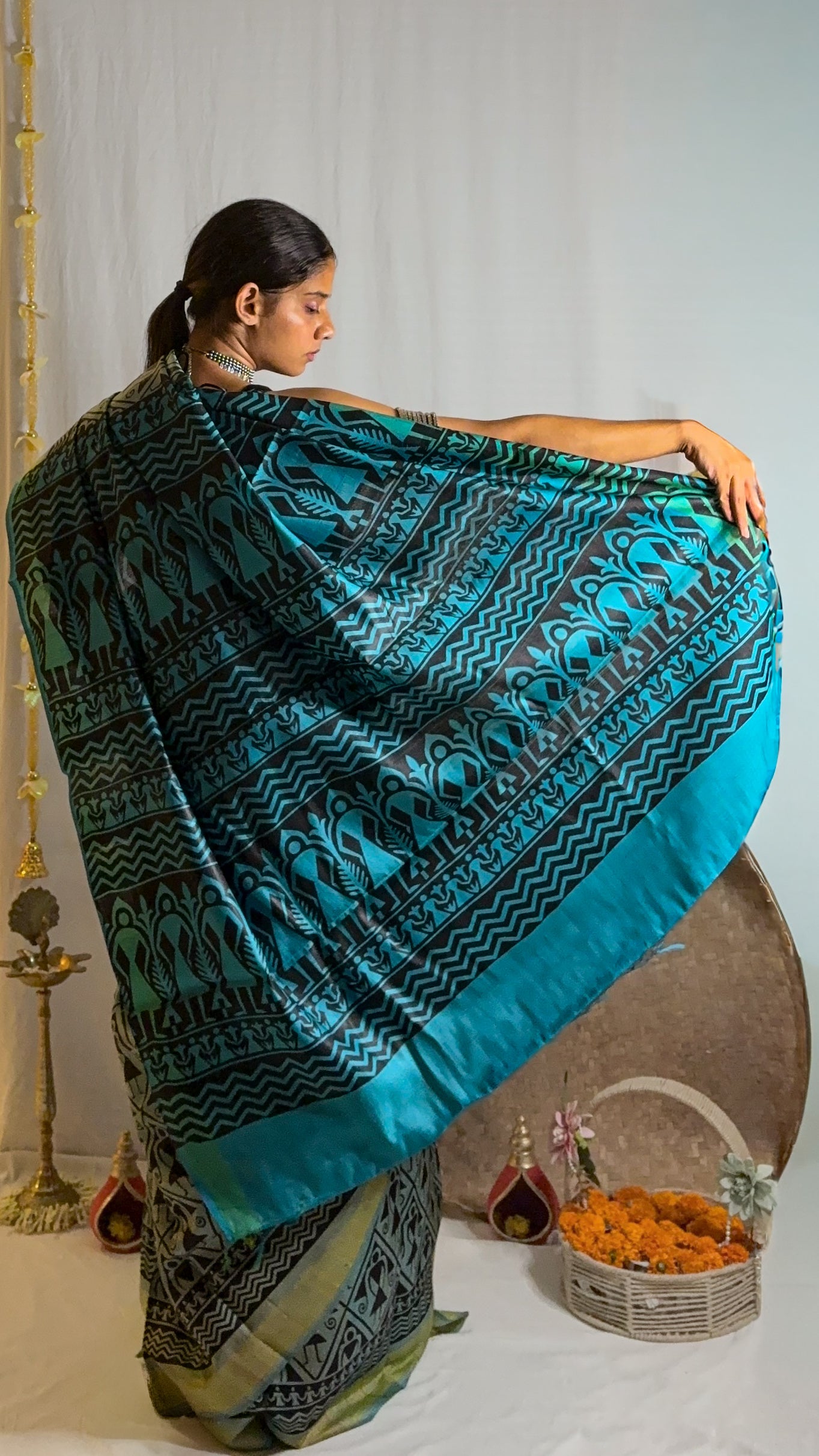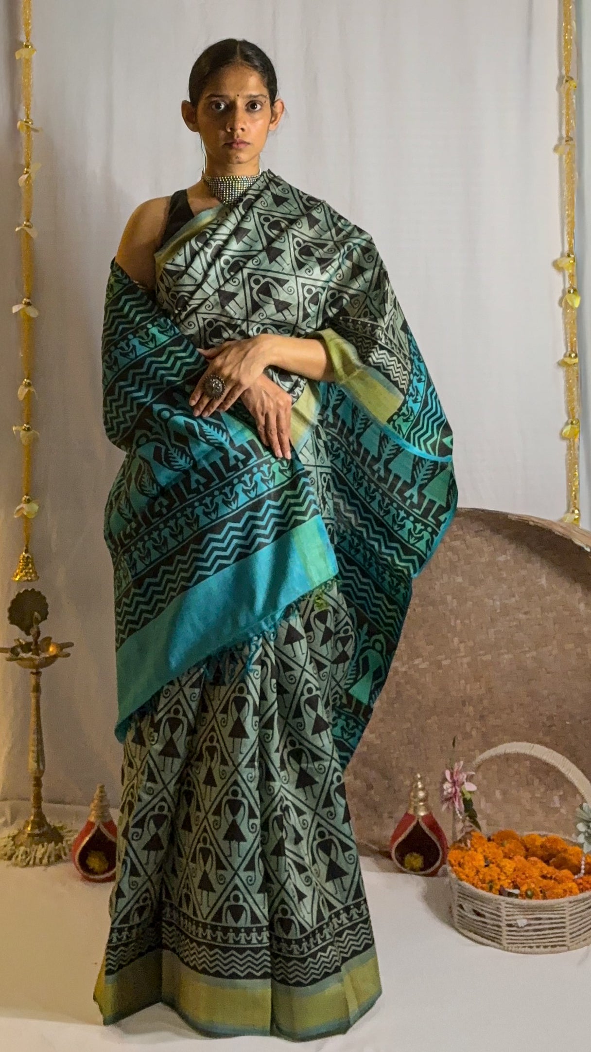 ‘Zuari’ is a nice blue and green Kosa silk saree that is handwoven and has Bastar art block print over it which is a speciality of Chhattisgarh.